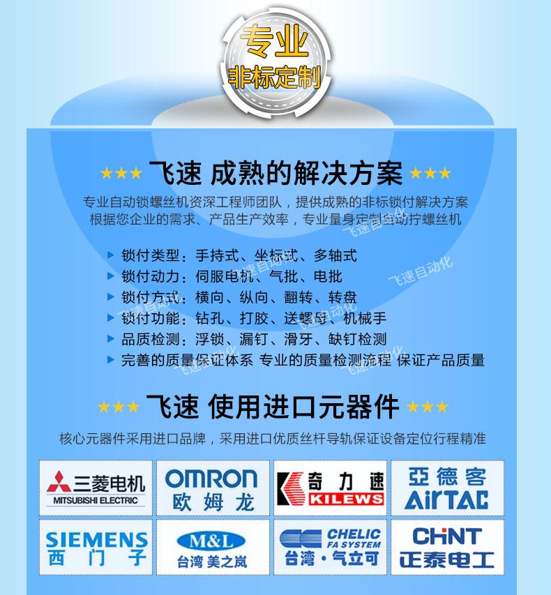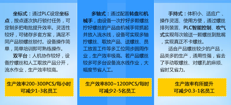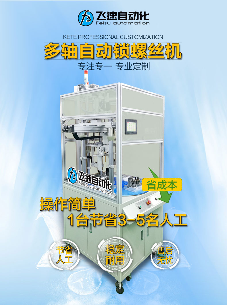 - 產品簡介: 伺服自動鎖螺絲機,有別于普通的電批、氣批,其采用伺服電機驅動,運轉速度更快,并能夠對擰緊過程進行細致的控制,簡單的說就是扭力大小值能夠精確在上下1%的范圍內,擰緊每顆螺絲都能夠按照給出的扭力值來執行,搭載PLC通過觸摸屏可任意調整每個電機的扭力值。