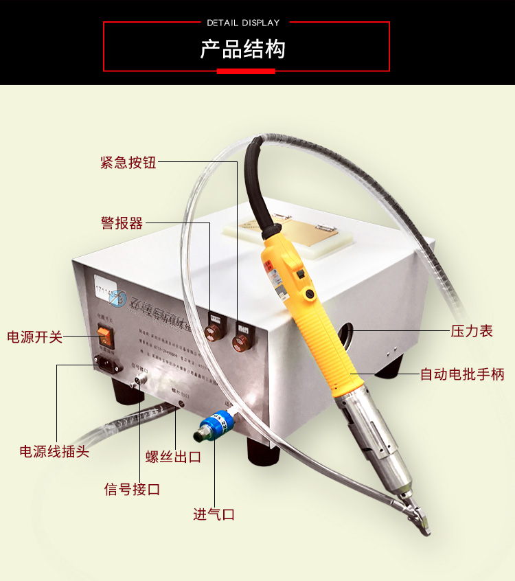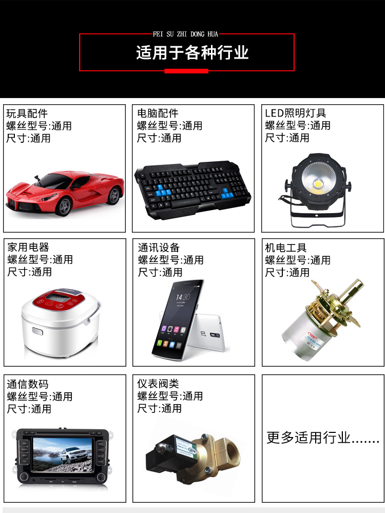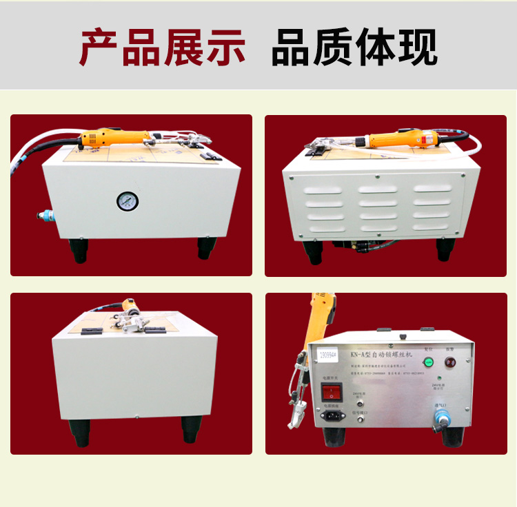 - 產(chǎn)品簡介: 手持式自動打螺絲機也叫自動供料鎖螺絲機、自動擰螺絲機等,嚴格來講,手持式只能算是半自動,因為它還是需要手工操作。一臺手持式自動鎖螺絲機主要由兩部分組成:自動供料機和電批,其中自動供料機是重要的,也是復雜的,它的好壞直接關系到機器卡不卡料的問題。1.采用渦輪上料,體積和噪音小、重量輕,可存放在工作平臺上,節(jié)省空間; 飛速手持式螺絲機: 1.螺絲自動排列、供料,自動篩選異型螺絲,自動補給空料,無料會自動報警; 2.送料采用感應器控制,鎖付完一顆來一顆,自動送料,不會出現(xiàn)重復給料現(xiàn)象; 3.滑牙不送料:在鎖付工程中,扭力達不到,螺絲不送出,防止批嘴出現(xiàn)卡料現(xiàn)象; 4.穩(wěn)定性好,不卡料,即使不良導致卡料,非專業(yè)人員也可以在幾秒鐘內(nèi)解決卡料; 5.效率高,一般1秒鐘打一個螺絲,不用抓起螺絲,只需對準螺絲孔位鎖緊螺絲即可; 6.可減少1到2個工人螺絲鎖付作業(yè),實現(xiàn)半自動化生產(chǎn),降低工人的勞動強度,提高生產(chǎn)率; 7.關鍵部位采用高品質(zhì)五金材料并經(jīng)過特殊處理,電子原器件采用原裝進口,確保設備零故障。 產(chǎn)品適用范圍 1.適用于各種類型的螺絲,螺絲總長應大于1.3倍螺帽直徑; 2.支持深孔螺絲鎖付,孔深小于40mm,M1-M6的螺絲; 3.適用于數(shù)碼、電子、小家電、電源開關、燈具、LED、玩具等產(chǎn)品。