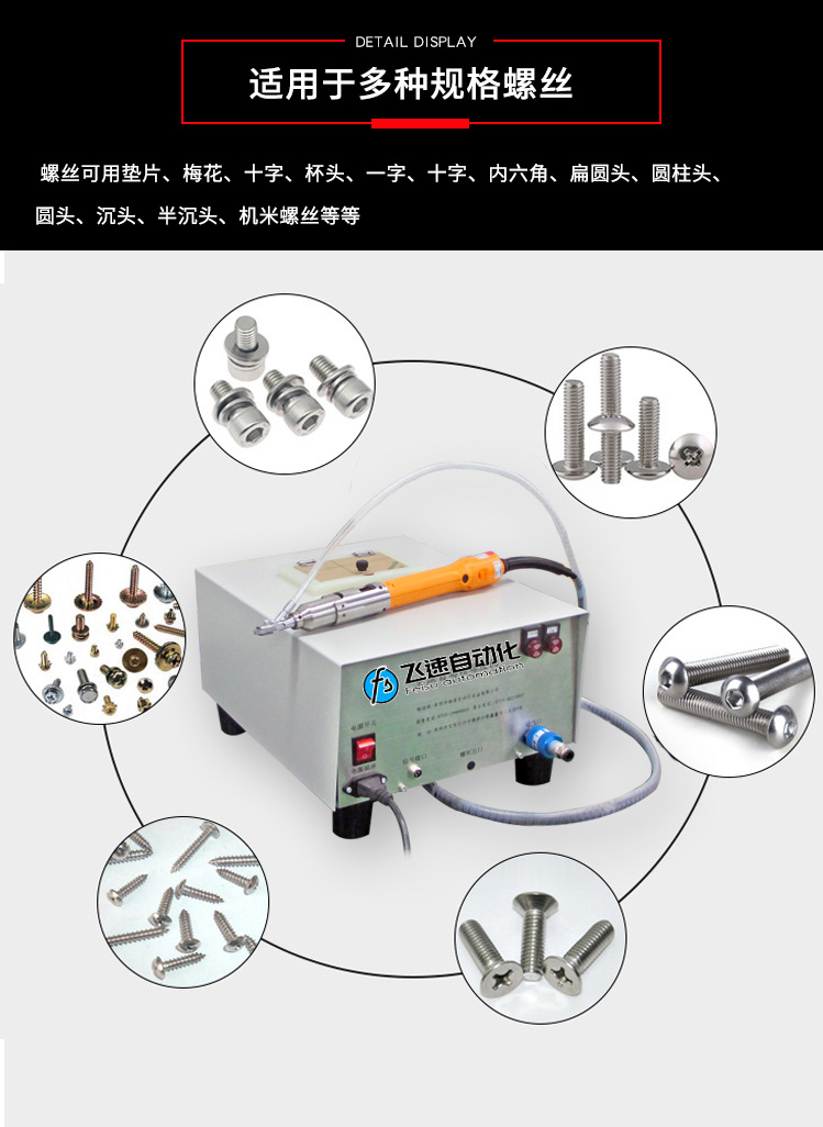 手持式螺絲機使用方法 深圳市飛速自動化設備有限公司專注自動鎖螺絲設備生產(chǎn)設計,擁有臺灣進口CNC、自動化數(shù)控設備、鉆床、銑床、線切割、精密自動車床等加工機設備50多臺套,是一家集方案設計、研發(fā)、制造、加工為一體的實力生產(chǎn)商。近年來為適應企業(yè)自動化生產(chǎn)需求,公司研發(fā)多種系列自動化鎖螺絲設備,廣泛用于通信、電子、電器、電腦、燈飾、玩具、建材、汽車等制造業(yè)。 熊先生:13923485762